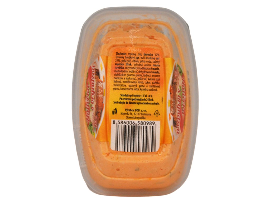 Repkový olej, BRYNDZA (23 %) /kravský hrudkový SYR, ovčí hrudkový SYR (25 %), jedlá soľ/, TVAROH (pasterizované MLIEKO, mliekarenské kultúry), cibuľa, pitná voda, sušený VAJEČNÝ žĺtok, prírodná aróma MASLA (SRVÁTKA, enzymaticky modifikované MASLO, maltodextrín, jedlá soľ, dehydrované MASLO, stabilizátor: guarová guma, farbivá: anato a kurkuma), jedlá soľ, kvasný ocot liehový, modifikovaný škrob, cukor, pažítka, stabilizátory: guarová guma a xantánová guma, konzervačná látka: kyselina sorbová