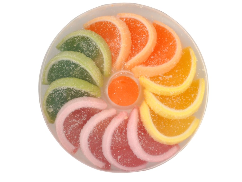 glukózový sirup, cukor, dextróza, želatína, kyselina: kyselina citrónová; arómy, farbivo: kurkumín, brilantná modrá FCF, karmín, beta-karotén; antokyány, polevové činidlá: včelí vosk, biely a žltý.
