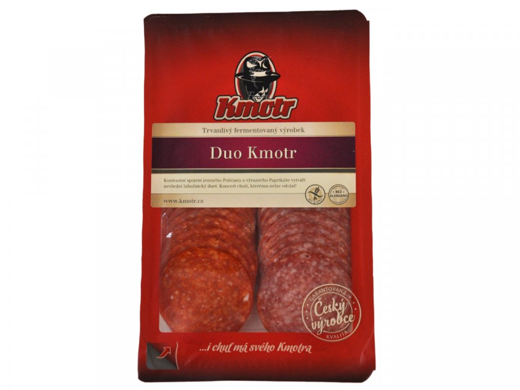 ZÁKONNÝ NÁZOV POTRAVINY: Duo Kmotr. Trvanlivý tepelne neopracovaný mäsový výrobok. Balené v ochrannej atmosfére.ZLOŽENIE