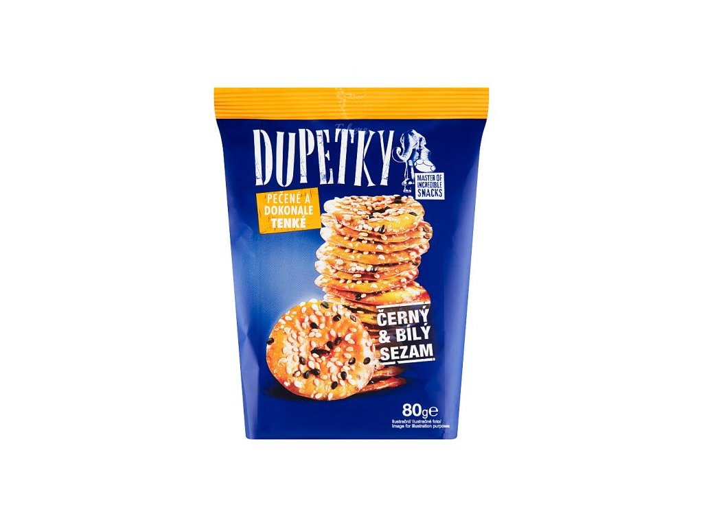 Popis produktu, Pečené a dokonale tenkéPraclíky s čiernym a bielym sezamomVhodné pre vegetariánovMarketing produktu, Dupetky sú pre každého milovníka slaného maškrtenia. Sú dokonale tenké, pečené pekne do chrumkava a navyše nezaťažujú vaše telo tak, ako vyprážané krekry.Ochutnajte ľahkosť Dupetek s čiernym a bielym sezamom a dajte si ich napríklad k šalátu, syrom alebo len tak večer k televízii.Značka, DupetkyHmotnosť, Brutto hmotnosť: 83,Zloženie, Pšeničná múka,Repkový olej,Čierny a biely sezam 7,5%,Cukor,Jačmenný sladový extrakt,Jedlá morská soľ,Emulgátor: sójový lecitín,Kypriaca látka: uhličitany sodné,Antioxidant: extrakty z rozmarínuAlergény, Jačmeň Obsahuje,Horčica Môže obsahovať,Sezam Obsahuje,Sója Obsahuje,Pšenica ObsahujeAlergény sú vyznačené:Veľké písmenáČíselná veľkosť, 80gDruh skladovania, Pri izbovej teplotePodmienky skladovania, Skladujte v suchu, chráňte pred teplom a priamym slnečným žiarením. Minimálna trvanlivosť do: viď dátum vyššie.Typ balenia, VreckoDiskusia