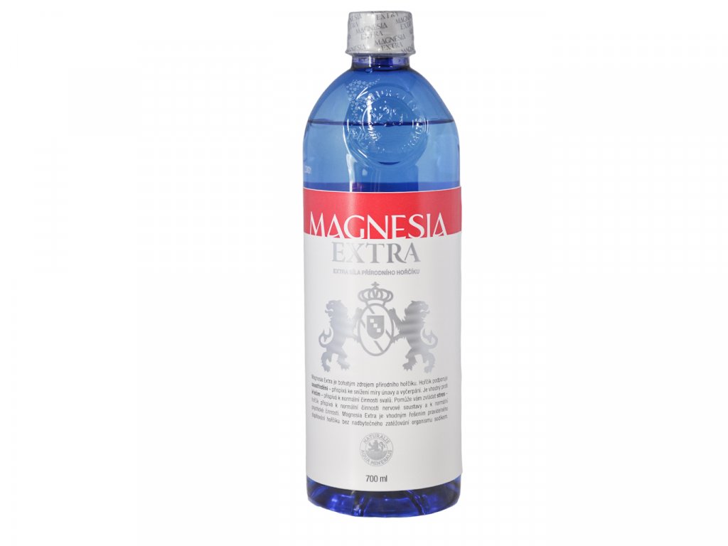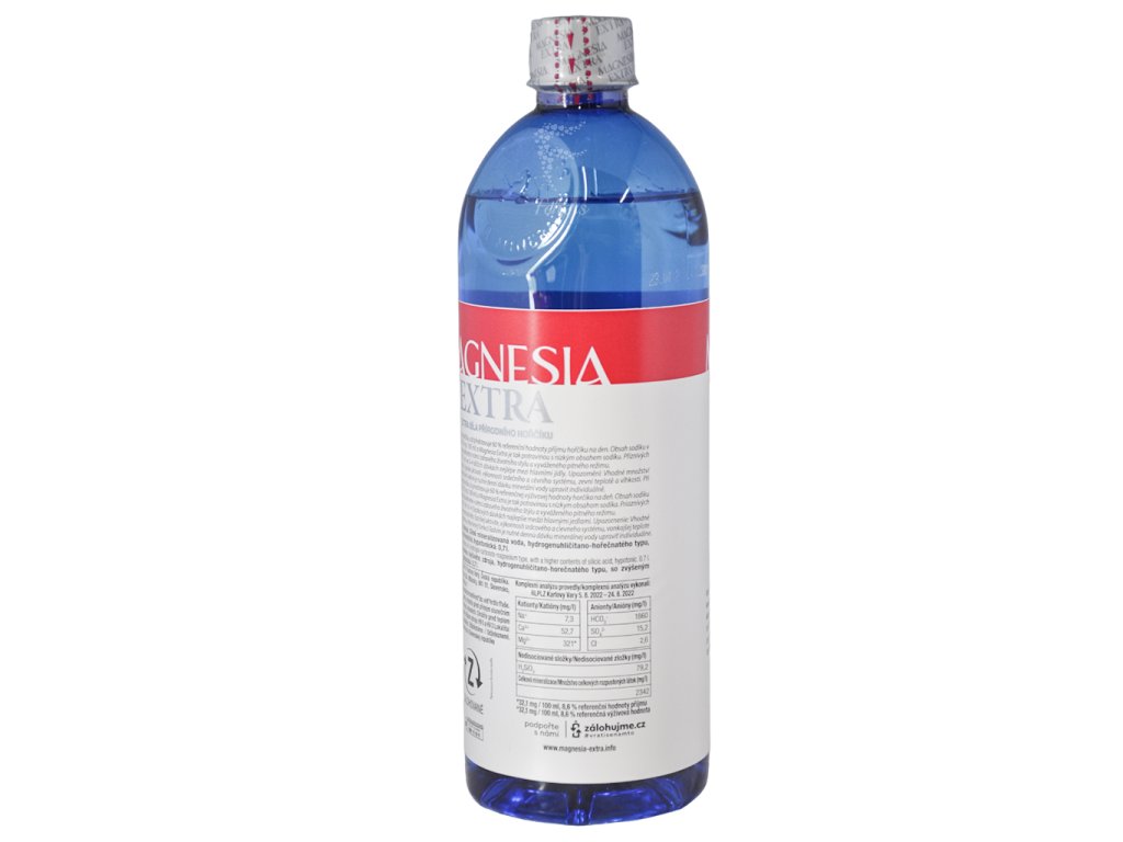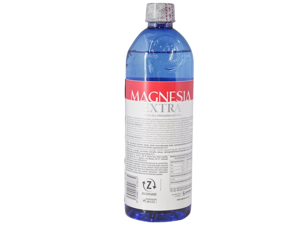 Popis produktu, Komplexnú analýzu vykonali: RLPLZ Karlovy Vary 6. 11. 2017.Názov zdroja: HV 5 a HV 3.Lokalita: Louka u Mariánských Lázní, Česká republika.OdželeznenéMinerálna voda z výťažku prírodného liečivého zdroja, hydrogenuhličitano-horečnatého typu, so zvýšeným obsahom kyseliny kremičitej, hypotonická.Marketing produktu, Magnesia Extra v 0,7 l obsahuje 210 mg horčíku, čo predstavuje 56 % referenčnej výživovej hodnoty horčíka na deň. Obsah sodíku v Magnesii Extra je len 4,06 mg v 0,7 l (0,58 mg / 100 ml) a Magnesia Extra je tak potravinou s nízkym obsahom sodíka. Priaznivých účinkov horčíka pri pití Magnesie Extra dosiahnete v rámci zdravého životného štýlu a vyváženého pitného režimu.Značka, MagnesiaBezpečnostné upozornenie, Upozornenie: Vhodné množstvo minerálnej vody záleží na hmotnosti tela, fyzickej aktivite, výkonnosti srdcového a cievneho systému, vonkajšej teplote a vlhkosti. Pri poruche obehového systému a zhoršenej funkcii ľadvín je nutné dennú dávku minerálnej vody upraviť individuálne.Príprava a použitie, Odporúčané denné dávkovanie: 0,7-1,4 l v 3-4 čiastkových dávkach najlepšie medzi hlavnými jedlami.Číselná veľkosť, 0.7lDruh skladovania, Pri izbovej teplotePodmienky skladovania, Minimálna trvanlivosť do: viď hrdlo fľaše. Skladujte v čistých, dobre vetraných skladoch. Chráňte pred teplom a priamym slnečným žiarením.Typ balenia, Plastová fľašaRecyklovanie, VratnáZálohovanéTento obal je zálohovaný len v Slovenskej repuplikeDiskusia