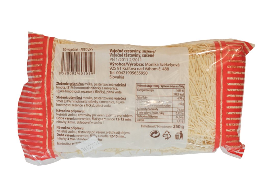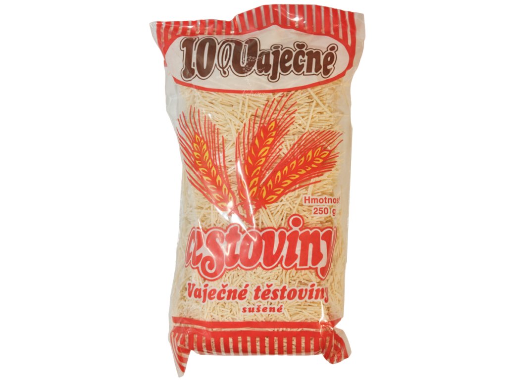 Zloženie: PŠENIČNÁ MÚKA, voda, VAJEČNÁ ZMES 4,24%. Neobsahuje geneticky modifikovaný organizmus. Priemerné výživové údaje na 100g výrobku: 1606kJ/378kcal, tuky 1,6g z toho...