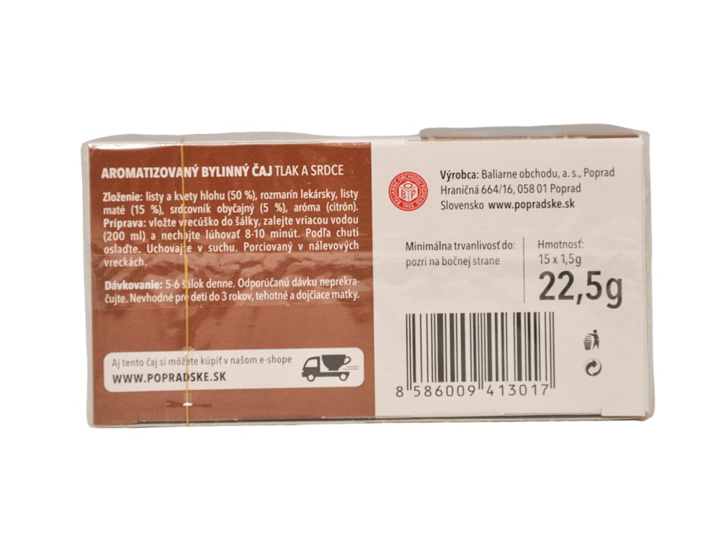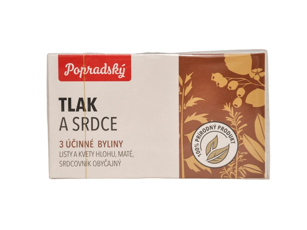 Popis produktu, Baliarne obchodu Poprad 1955.Aj tento čaj si môžete kúpiť v našom e-shope www.popradske.skTlak a srdceSrdce poháňa celé naše telo, umožňuje nám milovať, smiať sa a žiť naplno. Preto je dôležité starať sa oň. Prvým krokom k zdravému srdcu je informovanosť. Venovať pozornosť tomu, koľko prejdeme, by malo byť také ľahké, ako sledovať si jedálny lístok. Pre naše srdce je dôležité vyvinúť denne minimálne 30 minút bežnej fyzickej aktivity alebo napríklad svižnej chôdze na čerstvom vzduchu.100% prírodný produktAromatizovaný bylinný čaj tlak a srdce. Porciovaný v nálevových vreckách.Hloh - pomáha podporovať srdcové funkcie, podporuje zvyšovať prítok kyslíka a pomáha zlepšovať periférny krvný obeh. Pomáha regulovať srdcovú činnosť, podporuje normálnu funkciu srdca a kardiovaskulárneho systému,Srdcovník obyčajný - pomáha zlepšovať funkciu srdca a posilňovať krvné cievy, napomáha zvýšeniu elasticity a pevnosti krvných ciev. Má upokojujúci účinok na srdce a pôsobí na vysoký krvný tlak,Maté - pomáha pri únave, strese, psychickom a duševnom preťažení, počas prepracovanosti alebo slabostiĎalšie informácie:Hmotnosť: 15 x 1,5 g 22,5 g.Marketing produktu, 3 účinné byliny: listy a kvety hlohu, maté, srdcovník obyčajný.Byliny a ich vplyv na organizmusHloh - pomáha podporovať srdcové funkcie, podporuje zvyšovať prítok kyslíka a pomáha zlepšovať periférny krvný obeh. Pomáha regulovať srdcovú činnosť, podporuje normálnu funkciu srdca a kardiovaskulárneho systému.Srdcovník obyčajný - pomáha zlepšovať funkciu srdca a posilňovať krvné cievy, napomáha zvýšeniu elasticity a pevnosti krvných ciev. Má upokojujúci účinok na srdce a pôsobí na vysoký krvný tlak.Maté - pomáha pri únave, strese, psychickom a duševnom preťažení, počas prepracovanosti alebo slabosti.Značka, PopradskýHmotnosť, Brutto hmotnosť: 57,Zloženie, Listy a kvety hlohu (50 %),Rozmarín lekársky,Listy maté (15 %),Srdcovník obyčajný (5 %),Aróma (citrón)Bezpečnostné upozornenie, Nevhodné pre deti do 3 rokov, tehotné a dojčiace matky.Príprava a použitie, Príprava: vložte vrecúško do šálky, zalejte vriacou vodou (200 ml) a nechajte lúhovať 8-10 minút. Podľa chuti oslaďte.Dávkovanie: 5-6 šálok denne. Odporúčanú dávku neprekračujte.Číselná veľkosť, 22.5gDruh skladovania, Pri izbovej teplotePodmienky skladovania, Uchovajte v suchu. Minimálna trvanlivosť do: pozri na bočnej strane.Typ balenia, KrabicaDiskusia