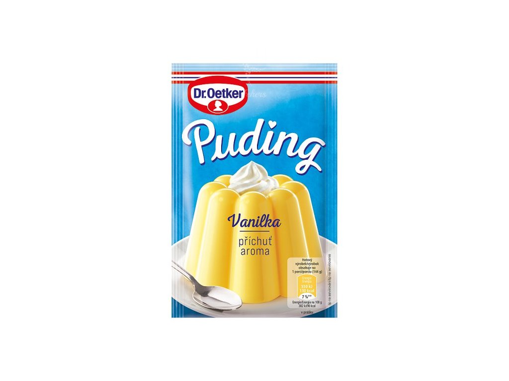 Popis produktu, Doma je tam, kde je puding. Vyrábame pudingy s láskou od roku 1923. Vychutnajte si pravú pudingovú klasiku.Puding v prášku s vanilkovou arómou na 1/2 l mlieka (4 porcie).Značka, Dr. OetkerZloženie, Kukuričný škrob,Aróma,Farbivá (karotény, riboflavíny)Alergény, Obilniny obsahujúce lepok Môže obsahovať,Vajcia Môže obsahovať,Mlieko Môže obsahovať,Orechy Môže obsahovaťAlergény sú vyznačené:Tučné,Alergény sú vyznačené:Veľké písmenáPríprava a použitie, Príprava:1. Obsah balíčka dobre rozmiešame v 1/3 pripraveného mlieka.2. Do zvyšných 2/3 mlieka pridáme 2-3 polievkové lyžice cukru (20-30 g) a mlieko privedieme do varu.3. Do vriaceho mlieka pomaly vlejeme pripravenú zmes a za stáleho miešania povaríme ešte asi 1 minútu.4. Hotový puding nalejeme do misiek alebo formičiek vypláchnutých studenou vodou a necháme stuhnúť.Číselná veľkosť, 38gDruh skladovania, Pri izbovej teplotePodmienky skladovania, Skladujte v suchu! Minimálna trvanlivosť do: uvedené na zadnej strane obalu.Typ balenia, Vrecko