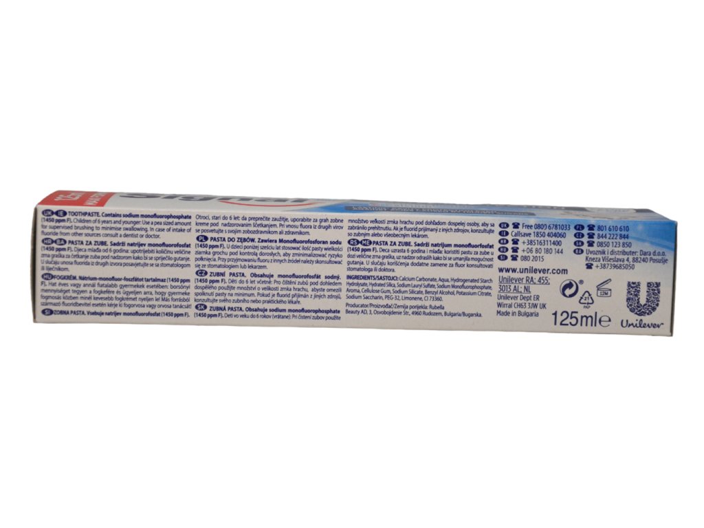 ZLOŽENIE: Calcium carbonate, Aqua, Hydrogenated starch hydrolysate,Hydrated silica,Sodium lauryl sulfate, Sodium monofluorophosphate, Aroma,Cellulose gum,Sodium silicate,Benzyl alcohol, Potassium citrate, Sodium saccharin,PEG-32,Limonene,CI 73360,Obsahuje sodium monofluorophosphate (1450 ppm F)