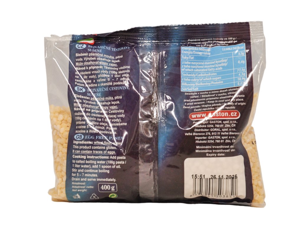 Zloženie: pšeničná múka, voda, vaječná zmes 4,24%. Neobsahuje geneticky modifikovaný organizmus. Výživové hodnoty na 100 g výrobku: Energia 1606kJ/378kcal, Tuky 1,6g, z toho...
