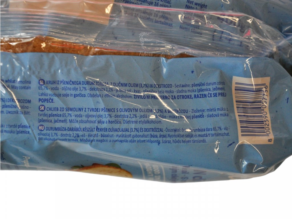Múka z tvrdej pšenice (65,7%), pitná voda, olivový olej (3,7%), dextróza (2,2%), jedlá soľ, droždie, pšeničná múka, pšeničná a jačmenná sladová múka. Ošetrené etylalkoholom.