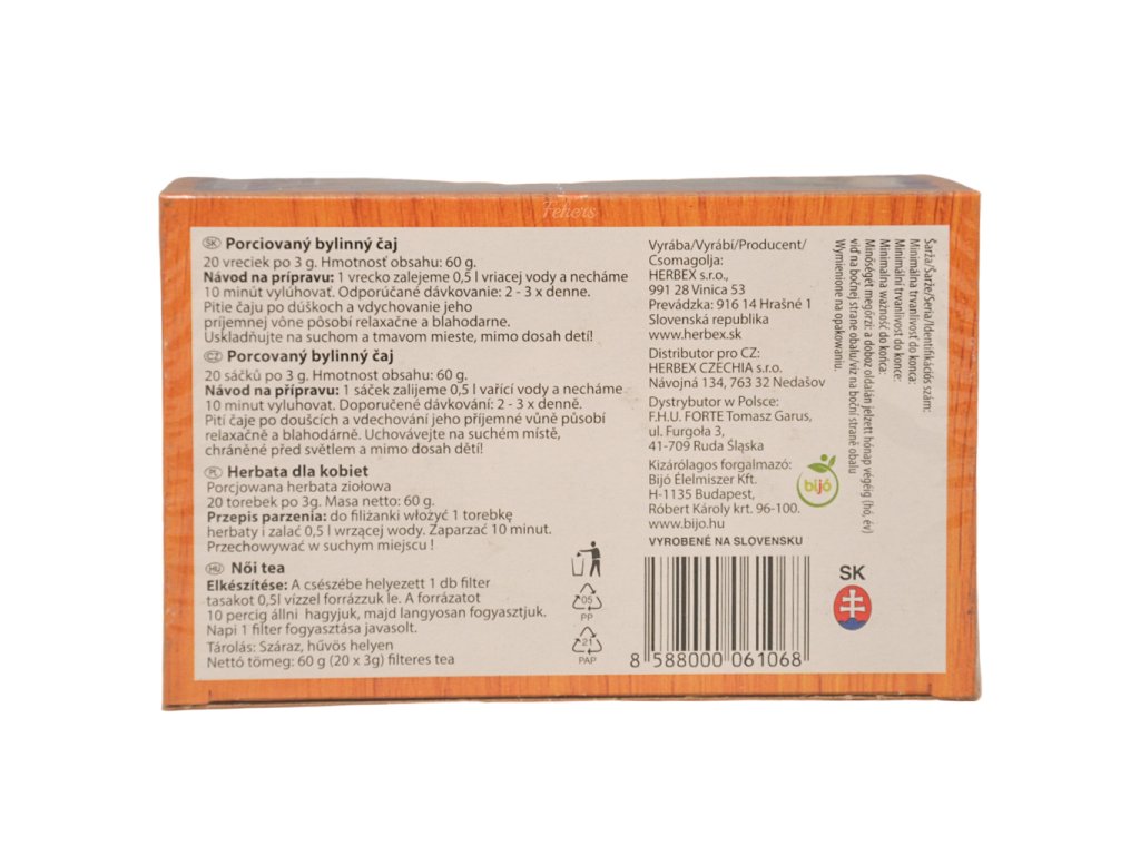 Alchemilka pomáha udržiavať pohodu pred a v priebehu menštruačného cyklu. Myší chvost upokojuje u žien menštruačné kŕče. Medovka prispieva k zníženiu napätosti a podráždenia. Návod na prípravu1 vrecko zalejeme 0,5 l vriacej vody a necháme 10 minút vylúhovať.